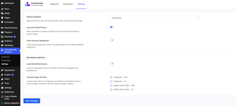 • Default Endpoint – Select which tab users will see first when they visit their account page (Dashboard, Orders, Downloads, Addresses, Payment Methods, Account Details, Logout, custom endpoints)