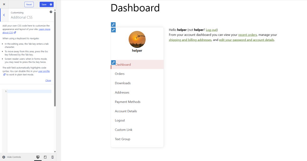 Additional CSS can be used to add your own CSS code to customize your account page, the way you want. You can see a CSS editor in the customizer, where you can add all the CSS code you want.