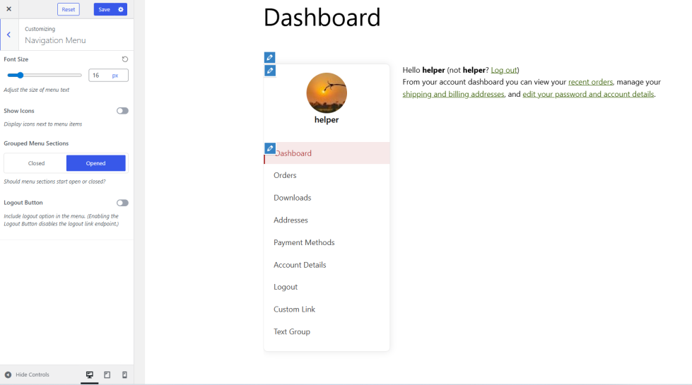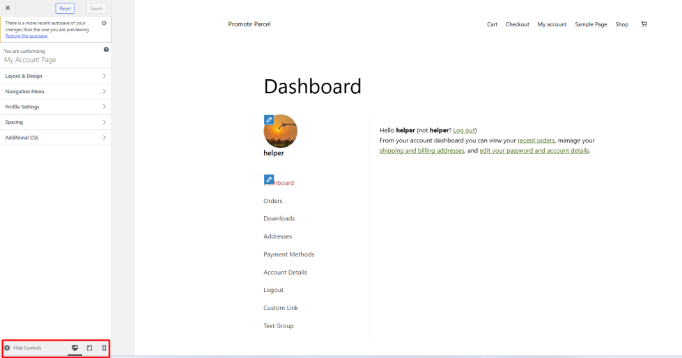 • Hide Controls – Toggle to hide or show the customization panel for an unobstructed view of your My Account page design
