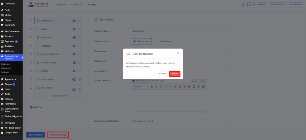 • Restore Defaults: Reset settings back to the original plugin state. Removes customizations and custom endpoints.