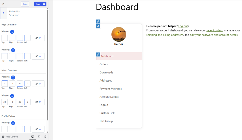 Control the spacing and layout of various elements on your My Account page with precise margin and padding adjustments.