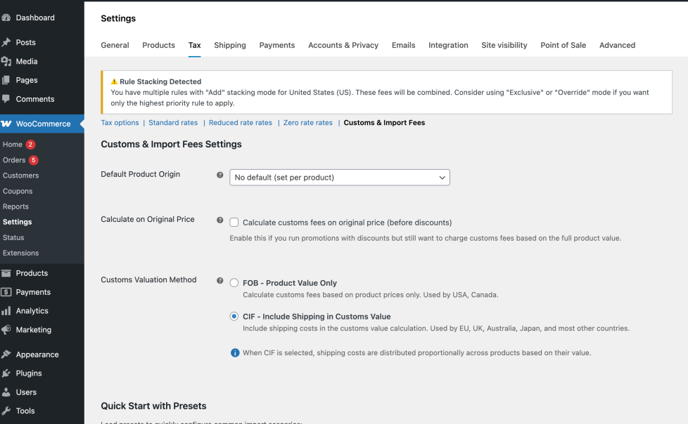 ↑ Back to topSet the default product origin country, this will apply to all new products unless you change it on the product. Then either manually add the fees, or use one of the presets. That’s it. Your fees will now be added. Make sure to verify this by testing it on the checkout page.