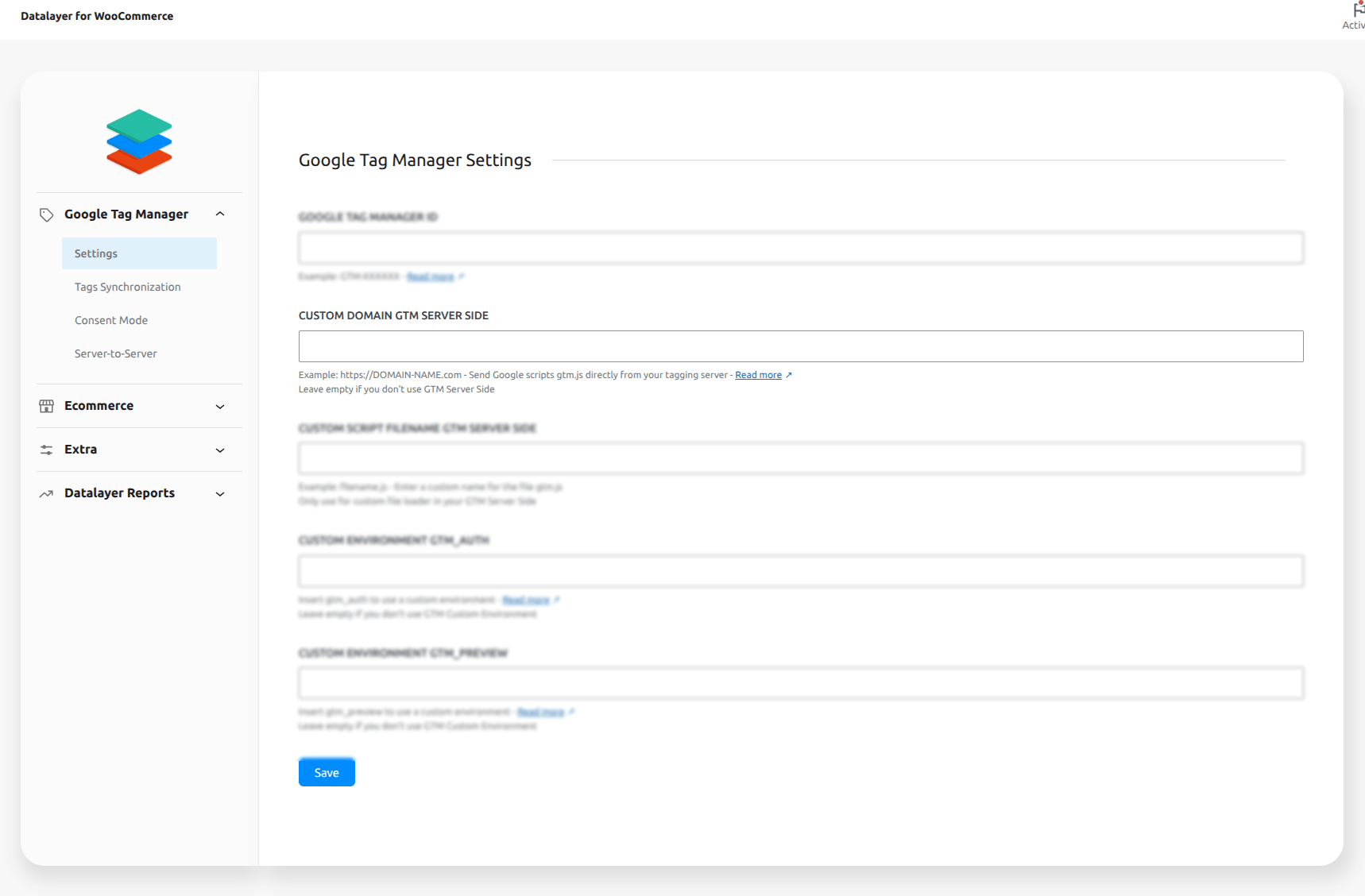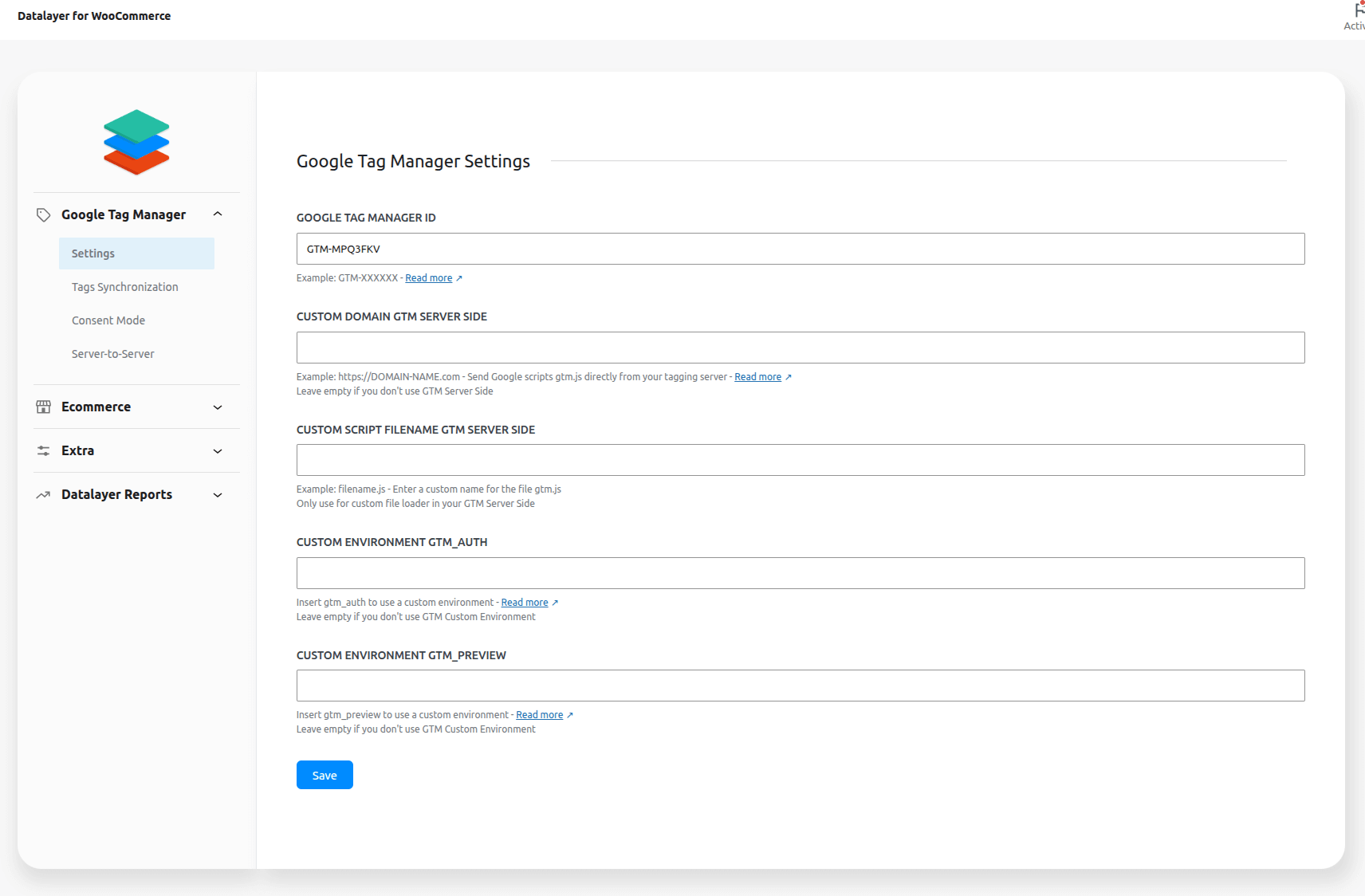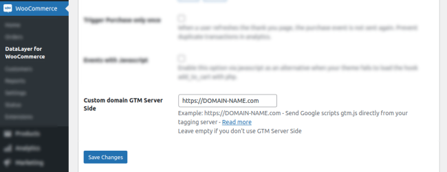 b โ In WooCommerce > Datalayer for WooCommerce > Google Tag Manager > Settings > Custom Domain GTM Server Side and add your server domain