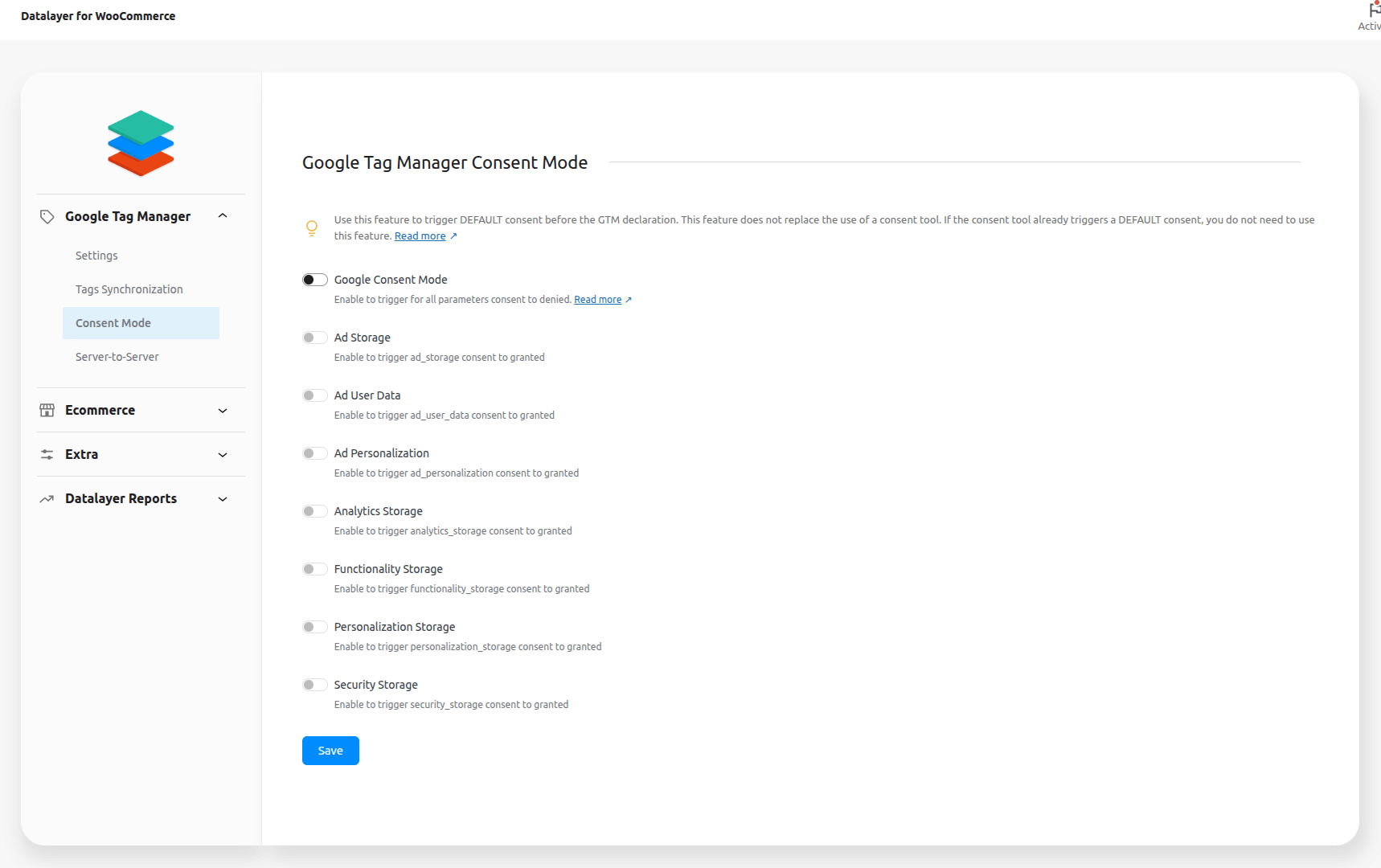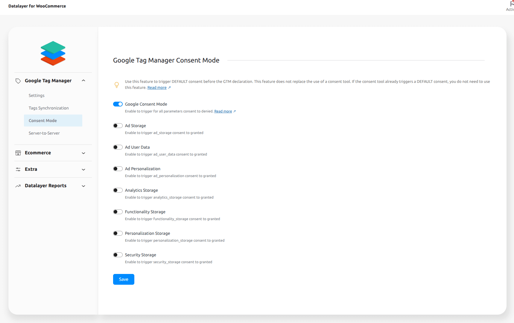 ↑ Back to topIf you want to use the GTM consent mode, it is important to know that Datalayer for WooCommerce works normally with this option, without any extra configuration in the plugin, what needs to be changed are the Google Tag Manager tags.