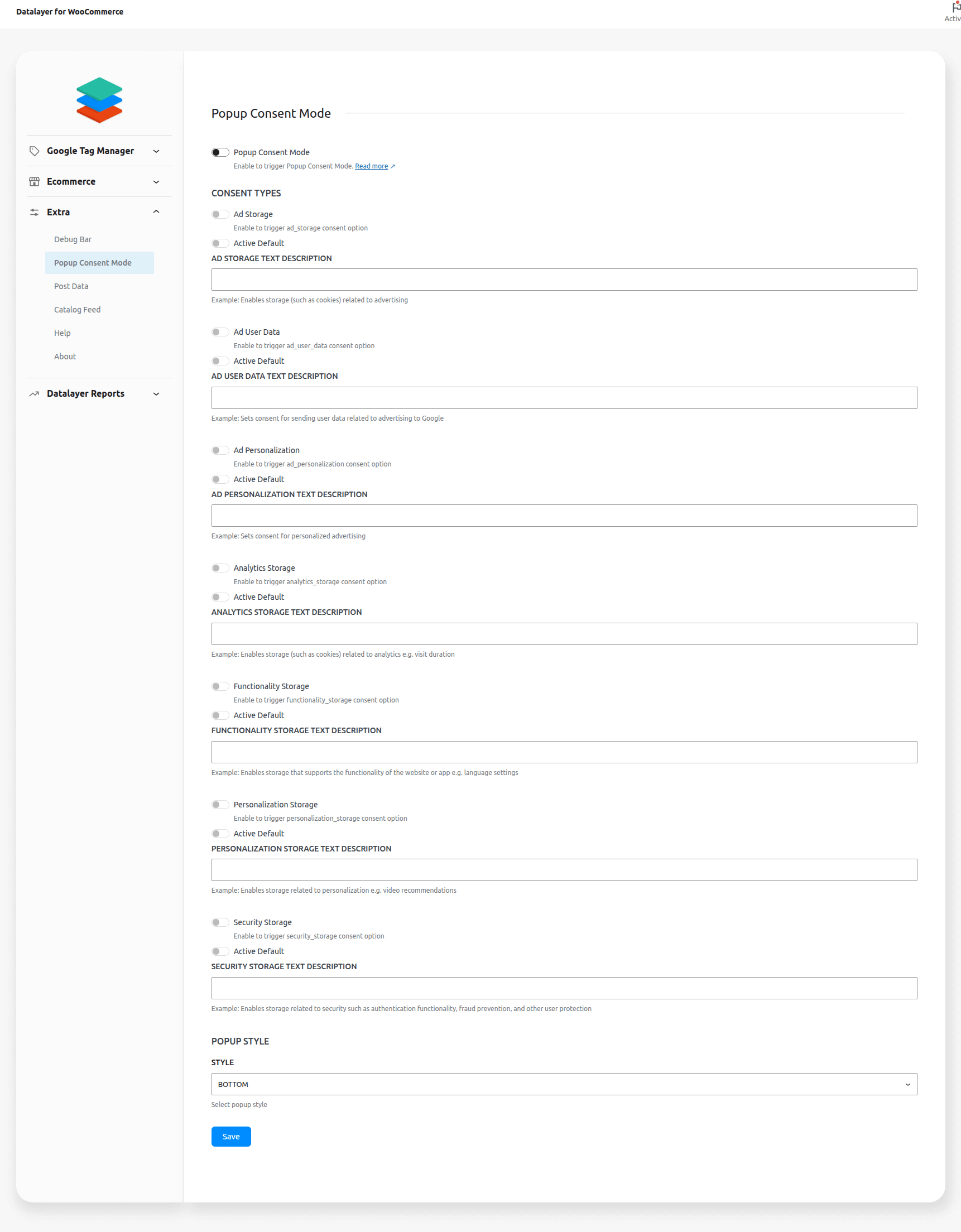 In WooCommerce > Datalayer for WooCommerce > Extra > Popup Consent Mode > Enable the option: Popup Consent Mode and configure the options