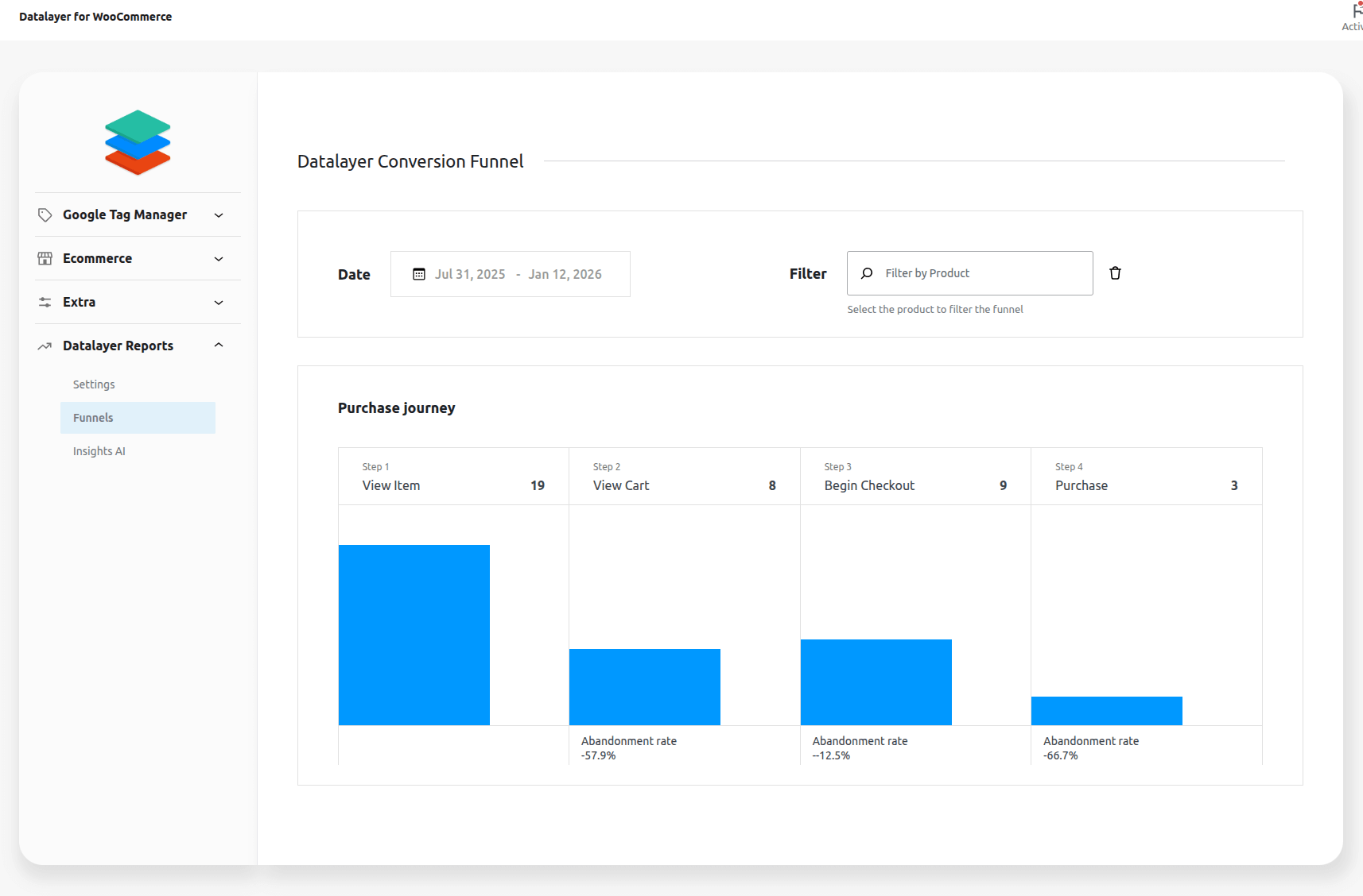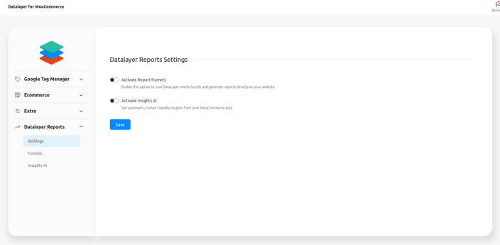 Activate Report Funnels -> Enable this option to save DataLayer events locally and generate reports directly on your website