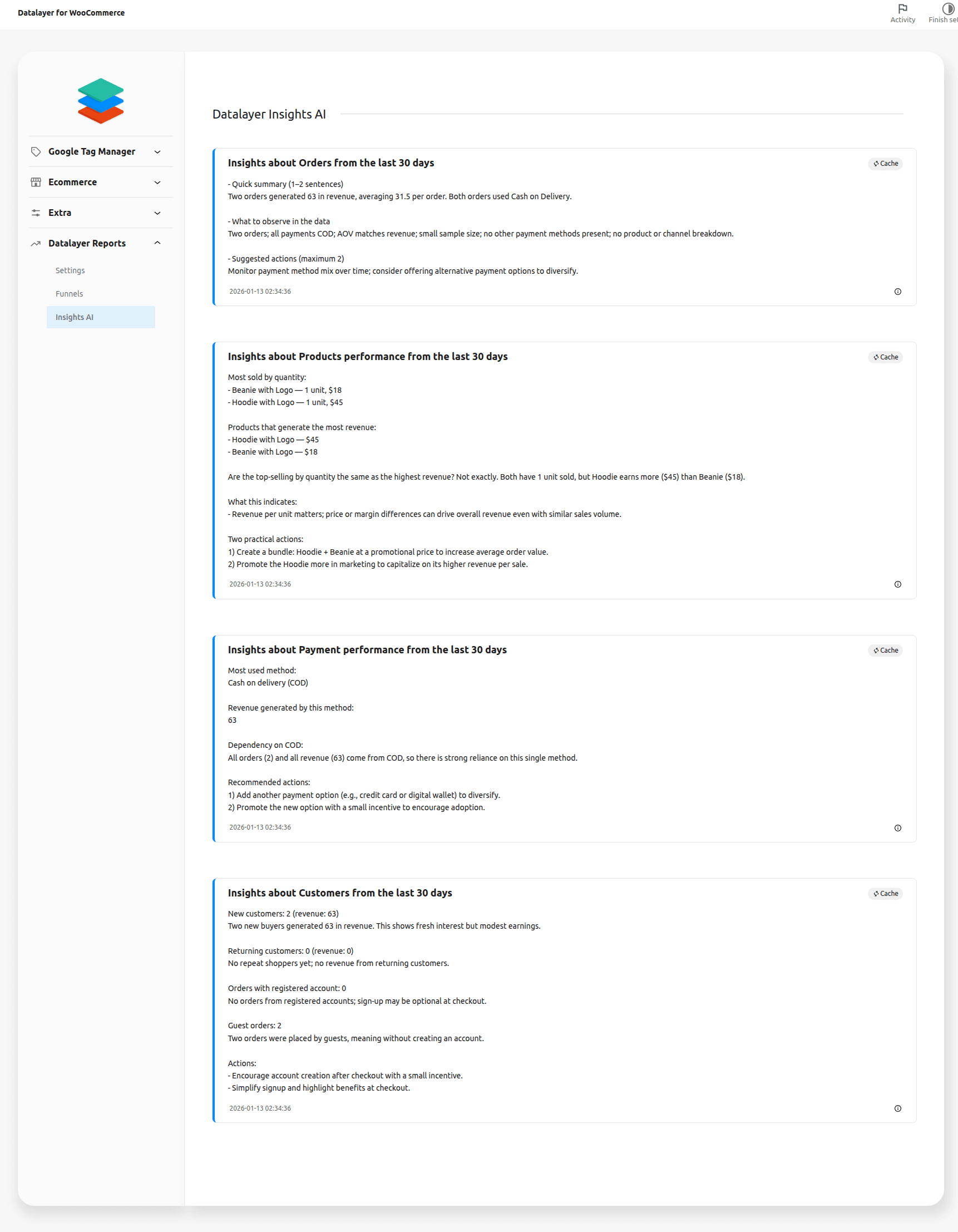 Activate Insights AI -> Get automatic, human-friendly insights from your WooCommerce data