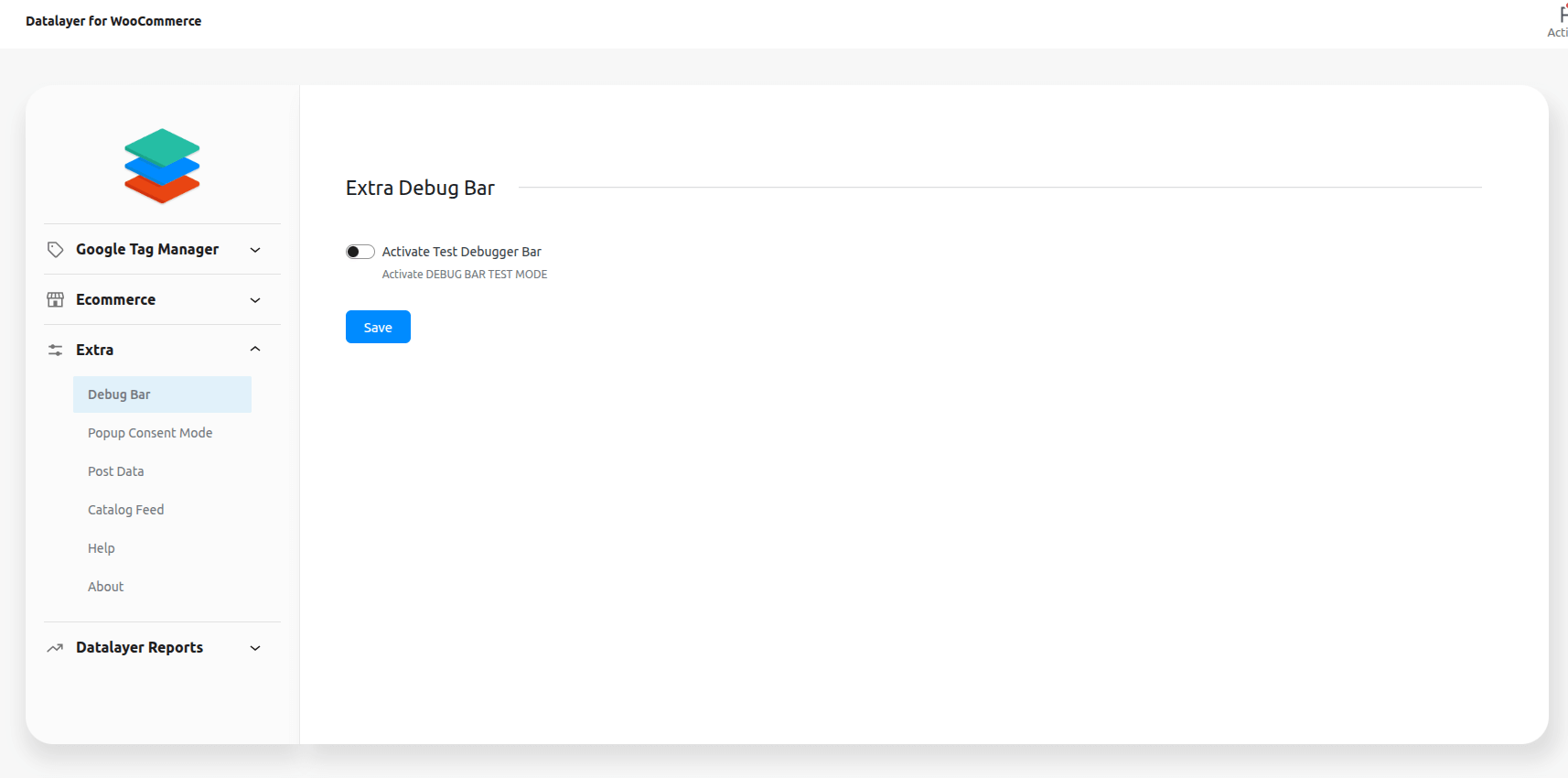 Activate Test Debugger Bar -> Enable this option to test Datalayer events on your site with the debug bar, by default, turned off