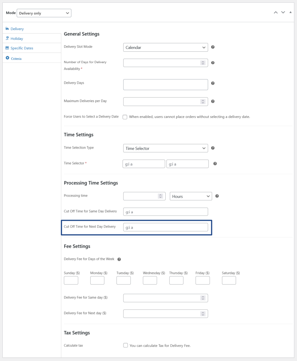 You can optionally charge a fee for Next Day Delivery orders. The value set in this field will be charged as fee.