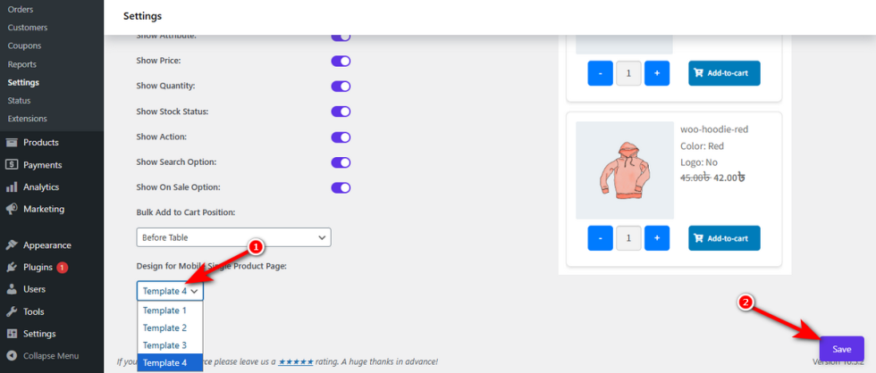 Find the “Design for Mobile Single Product Page” dropdown. Select the specific template from four templates that creates the best mobile shopping flow, such as “Template 4”.Click the ‘Save‘ button at the bottom right.