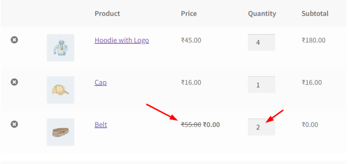 - If ‘Cap’ ( $16 ) is added to cart with 1 qty & ‘belt’ ( $55) is added with 1 qty, then both will be set to free.