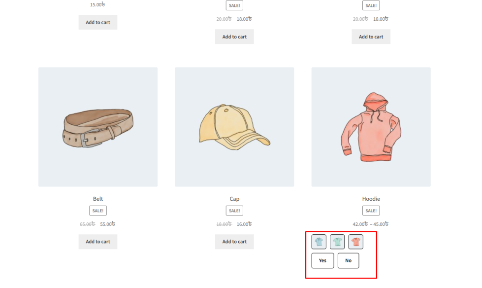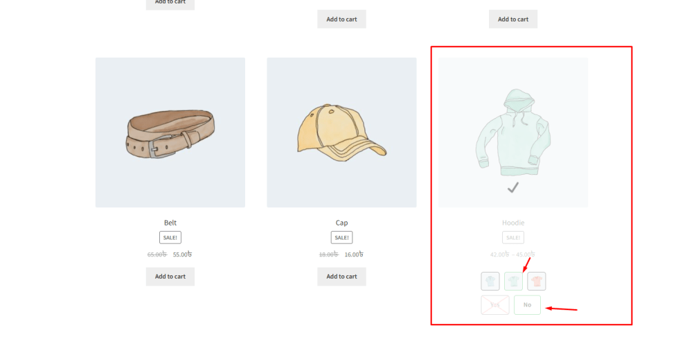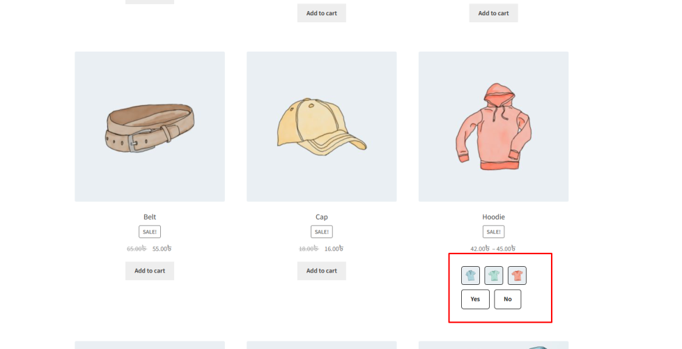 ↑ Back to topWhen variation swatches are displayed on the shop or archive page, they appear inside the product card along with the product image, title, and price. Depending on your store design and theme layout, you may want to adjust how these swatches are aligned within the product card.