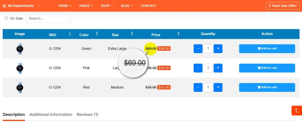 Note: To see the table and sale price on a variable product’s detailed page, keep the Variation Table switch turned on.