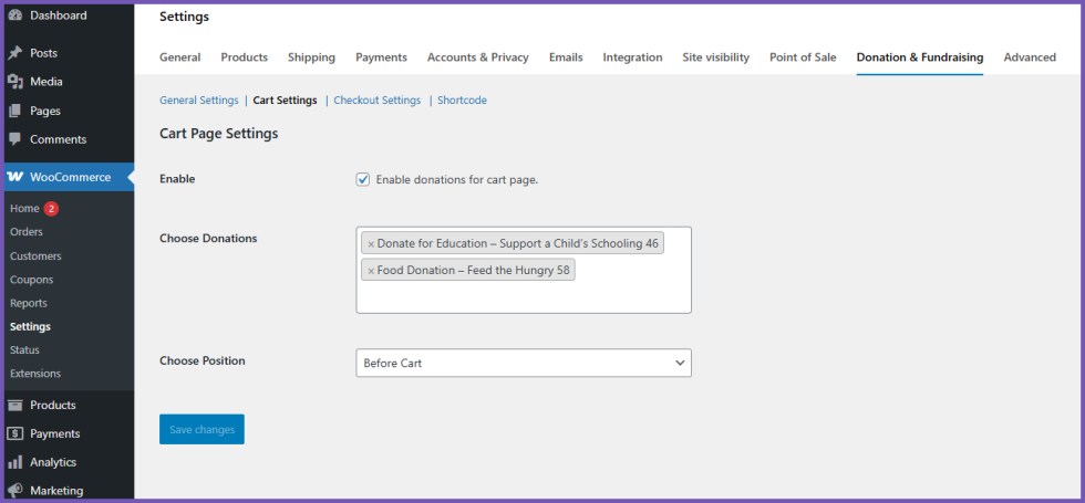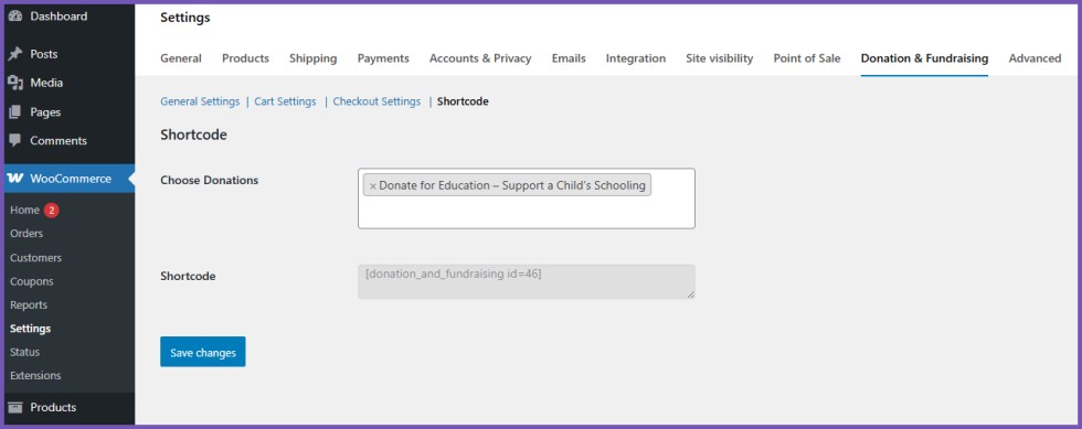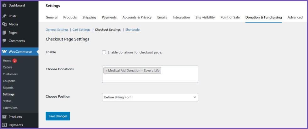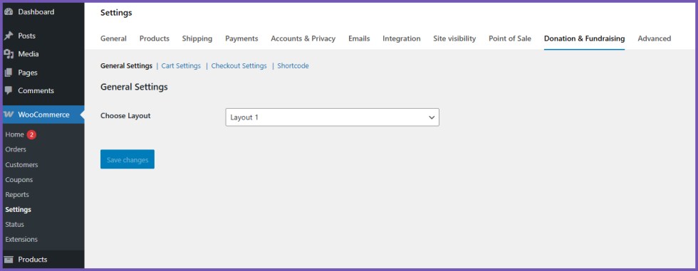 - For general settings, go to WooCommerce → Settings → Donations & Fundraising.