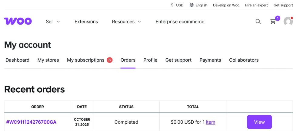 ↑ Back to top- Log in to WooCommerce.com and navigate to My account > Orders.