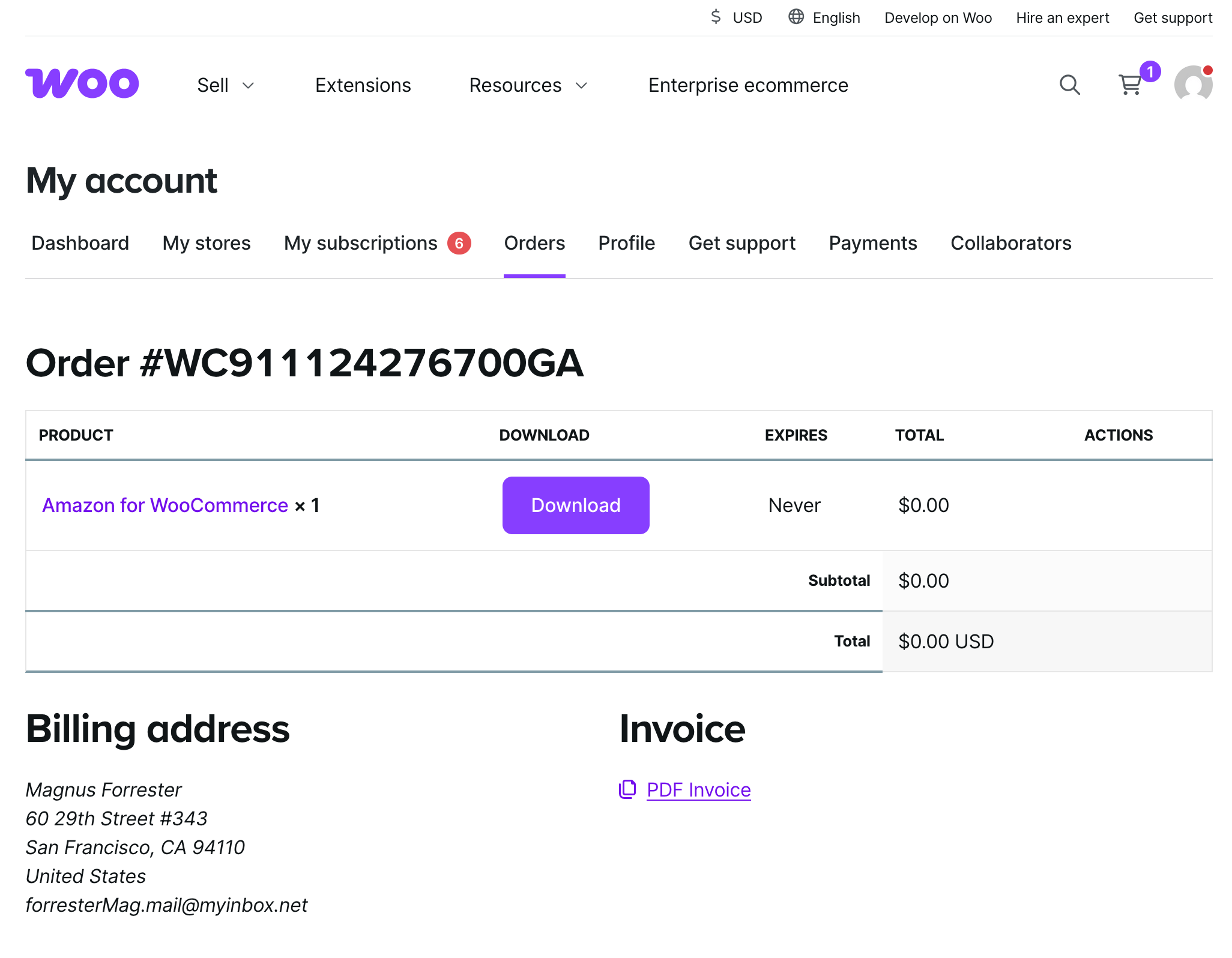 ↑ Back to top- Log in to WooCommerce.com and navigate to My account > Orders.