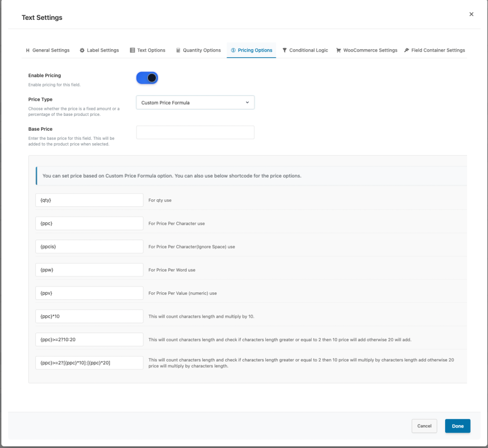 Pricing: Set fixed price per option in the free version. Premium adds percentage, custom amount (e.g. donations), percentage of product price, and dynamic per-unit pricing.