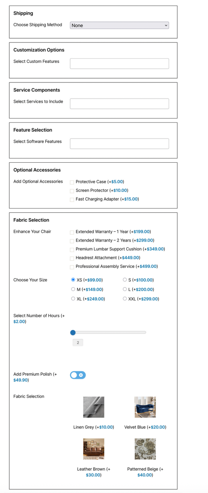 ↑ Back to topSections: Use sections to group fields (e.g. “Gift wrap” vs “Engraving”). You can set section titles, descriptions, and layout (single/two columns). In premium, section layouts (accordion, tabs, step wizard) are available.