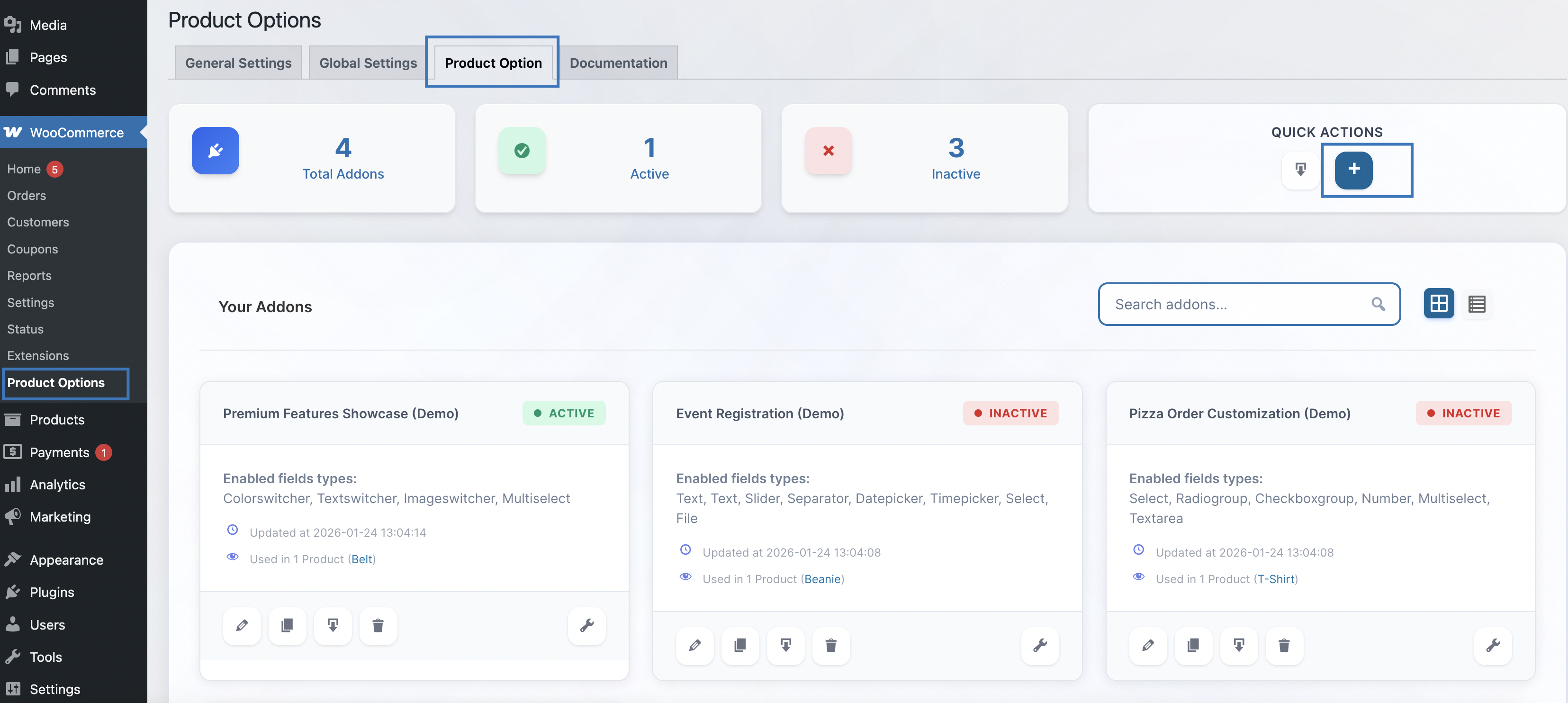 WooCommerce settings: Configure how options appear in cart, checkout, order details, and emails (labels, tax, etc.) from the add-on’s WooCommerce settings tab.