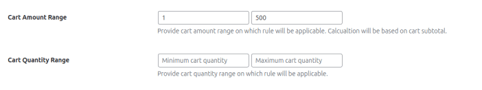 - Cart Amount Range: Set a minimum and/or maximum cart amount to determine when this rule will be applied. The calculation is based on the cart subtotal.
