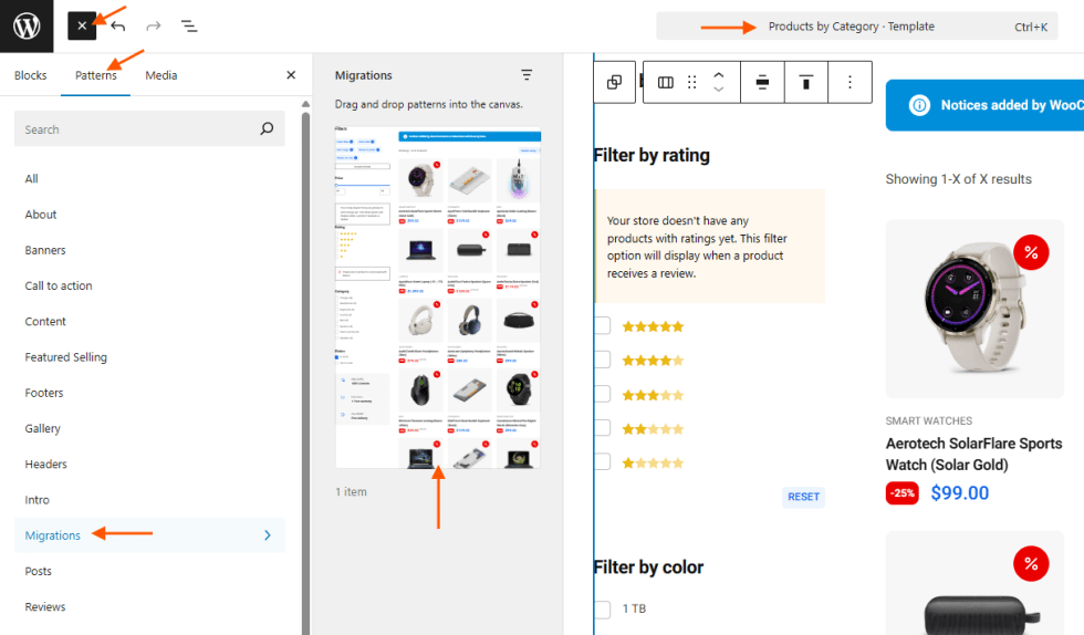 - Insert the New Block: Click + to add a block. Browse to Patterns > Migrations and select Archive content section with product filters for WooCommerce 10.2. Position it in place of the old one.