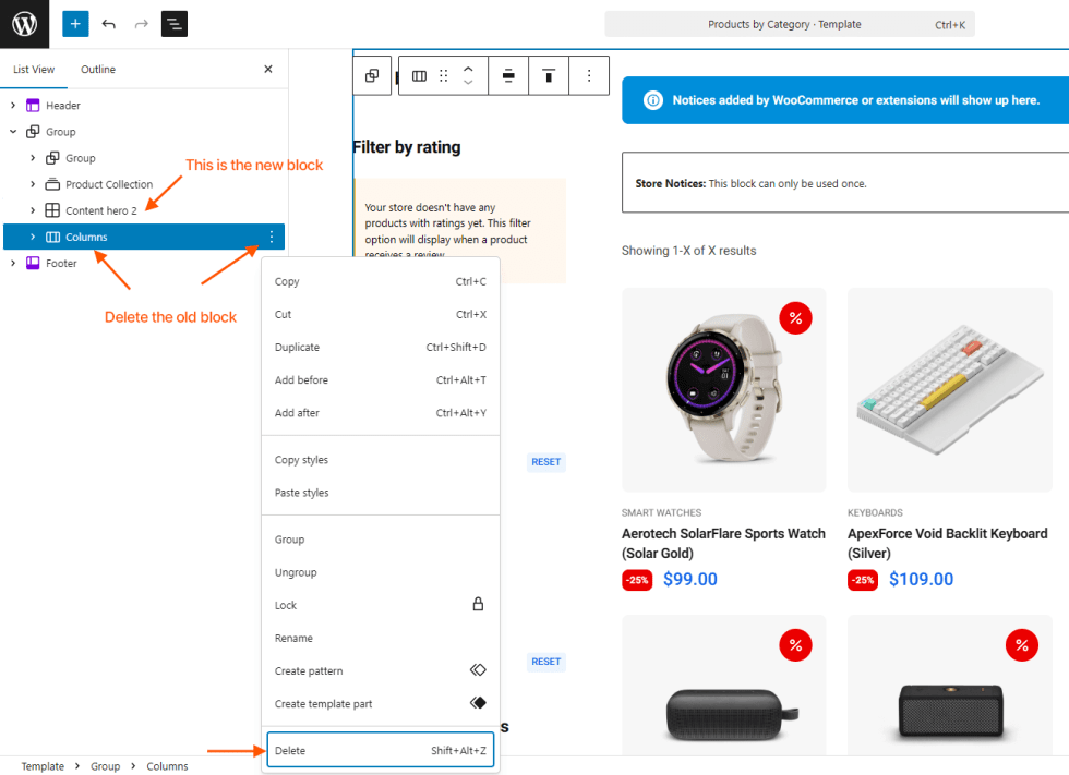 - Remove the Old Block: Select the Content Section block and delete it. If you’ve made customizations earlier, remember to move those blocks into the new one.