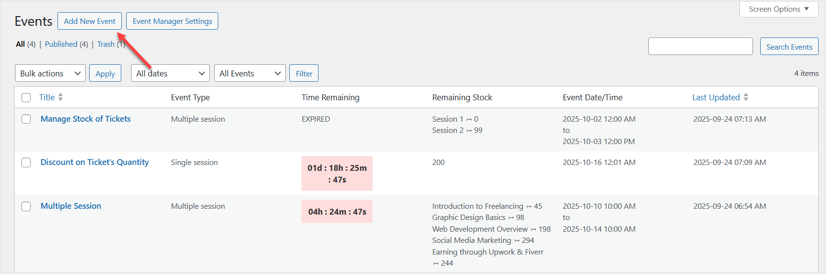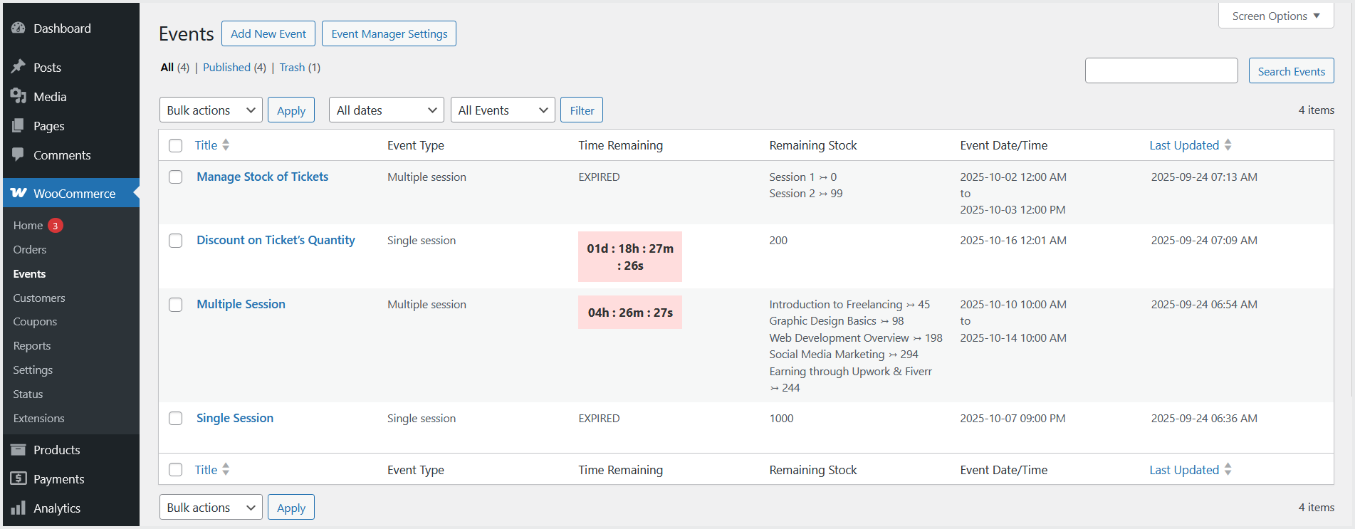 ↑ Back to topGo to WooCommerce>Events at the admin panel, to manage all the events created by you. Here you can see all the existing events with their name, remaining date & time, stock and more in a table form.