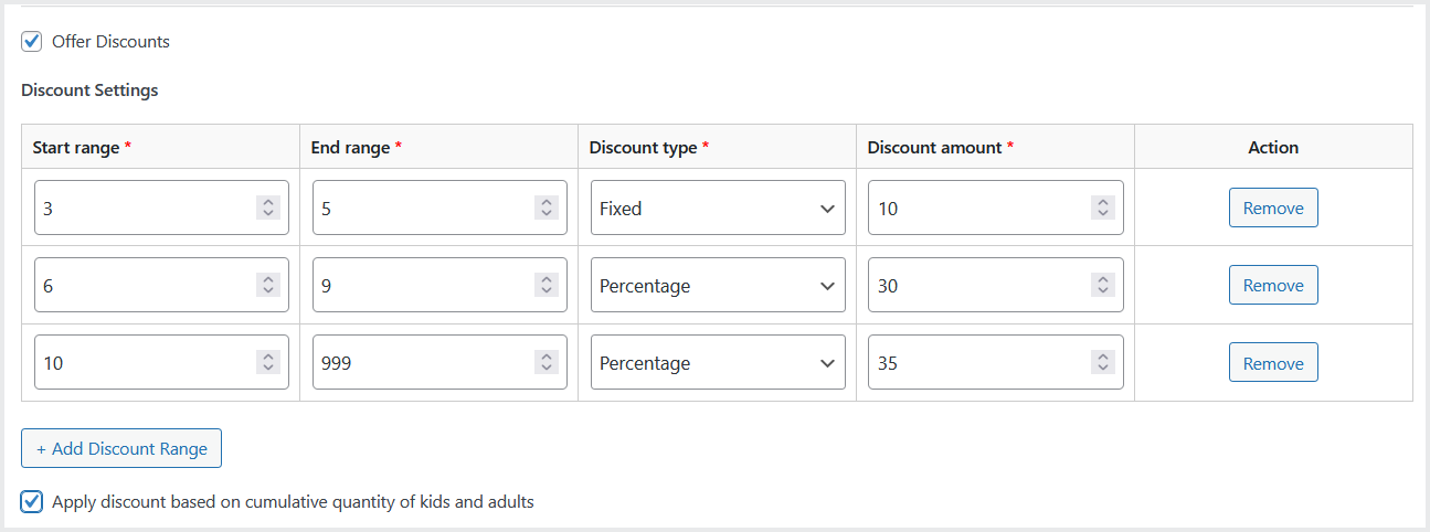 You can also provide the discount based on the quantity of tickets a customer will purchase. Option to give a discount on cumulative quantity of kids and adults.