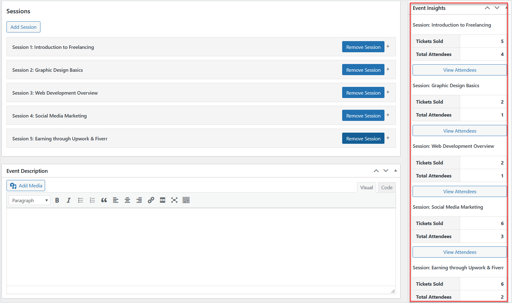 ↑ Back to topYou can also find the “Event Insight “ section at the right bottom of the page to check the total number of sold tickets and attendees by each session once the event is completed.