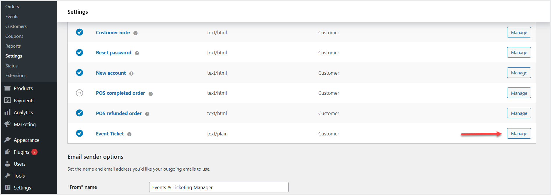 ↑ Back to topGo to WooCommerce>Settings>Email and look for “Event Ticket” and click the “Manage” button to customize the event ticket order email.