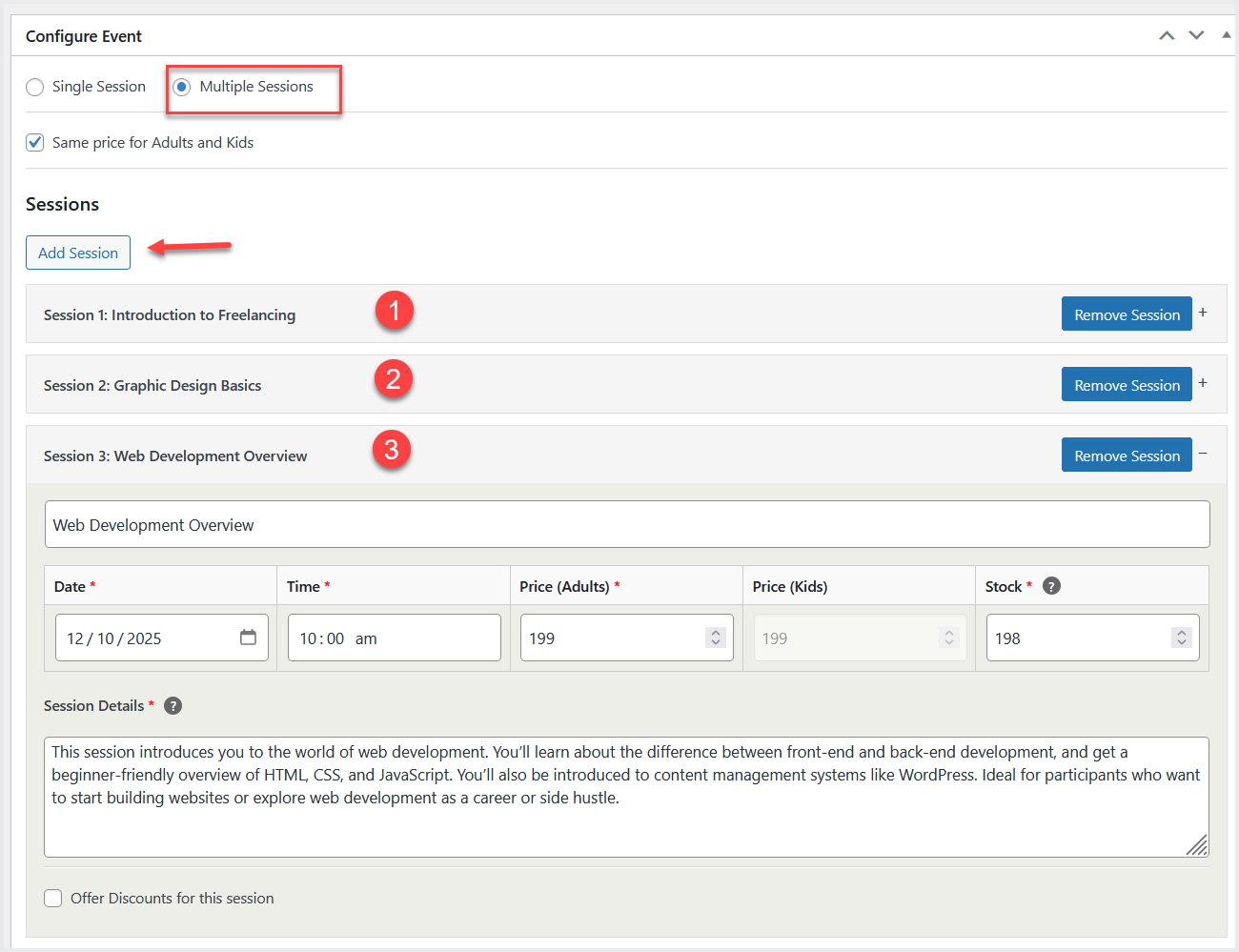 ↑ Back to topSelect “Multi-Session” to create multiple sessions for each event. The setup remains similar, but instead of a single block of details, you will see separate accordions for each session. You can click the “Add Sessions” button as many times as you require to add multiple sessions. And each session setting is the same as described above.