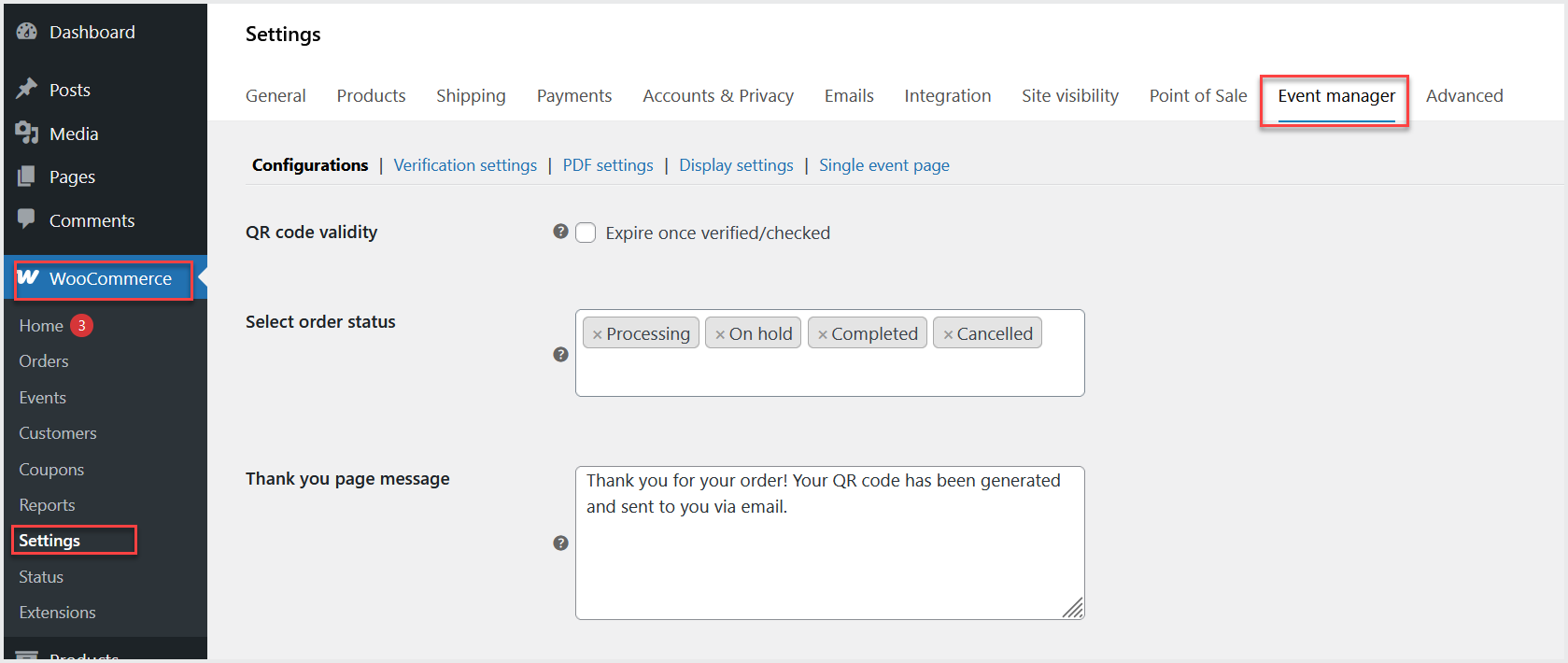 Click the “Configuration” tab for QR code settings. You may choose whether a QR code should expire after it has been verified once or remain reusable for multiple entries. Additionally, you can define the specific order status that will trigger the automatic sending of ticket emails to customers. This section also allows you to customize the Thank You page message, informing customers when and how they will receive their tickets after completing a purchase.