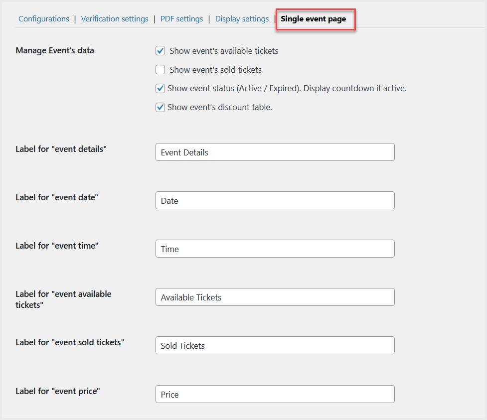 ↑ Back to topIn this tab, you will find the settings to manage the “Single Event Page”. You can control which event data should be displayed or hide and customize the labels.