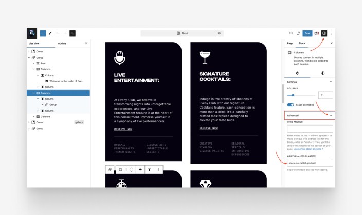 ↑ Back to topBy utilizing the Advanced block setting, you have the option to assign a CSS class to your block, enabling you to craft custom CSS for personalized block styling. You can include extra CSS classes by selecting the specific element and inputting the desired class into the “Additional CSS class(es)” field within the Advanced panel: