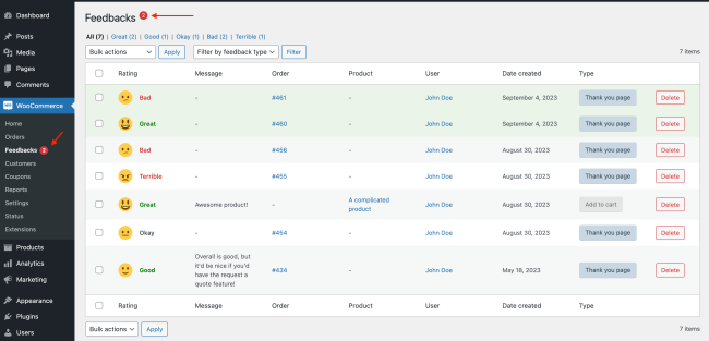 ↑ Back to topAll collected feedback is stored in WooCommerce -> Feedbacks page. Here you can delete, sort, and filter them.