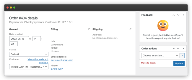 Similar to the add-to-cart feedback, every order that collected this feedback will show the feedback on the order page: