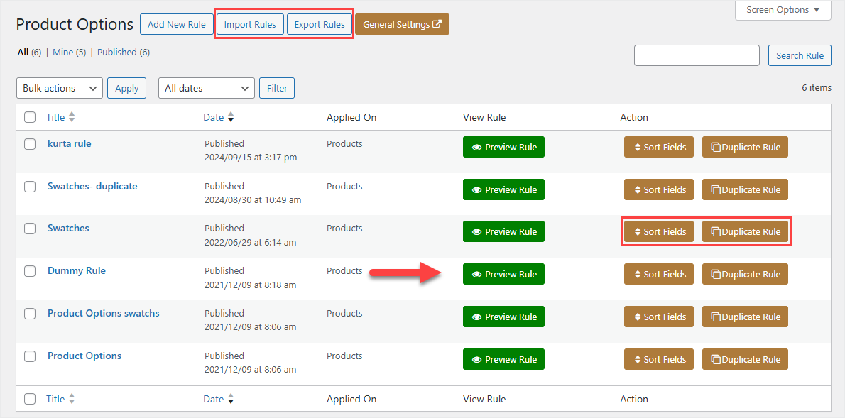 Here you can see and manage all the created rules and you can edit, preview, and duplicate them as well. You can also import and export the rules from here.