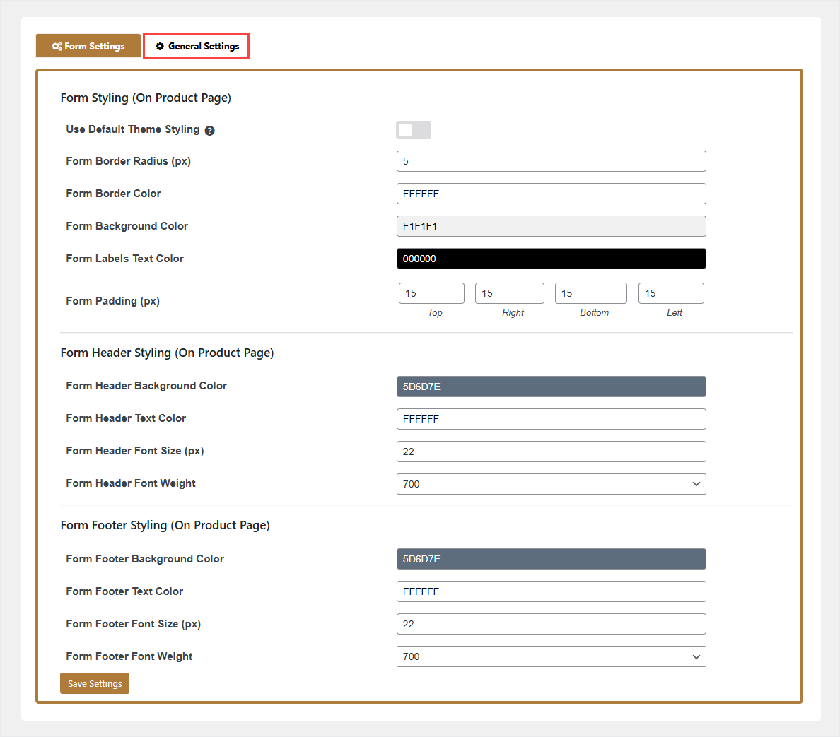 ↑ Back to topGo to WooCommerce>Settings and click Extra Product Options > Form Settings