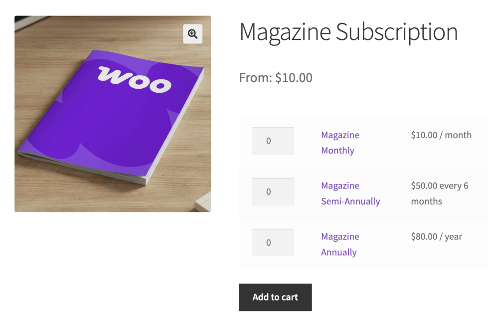 ↑ Back to topWhen displaying a variable subscription’s price on the store page, Subscriptions displays a “From: $x / period” price. This the lowest possible price at which a customer can access a subscription.