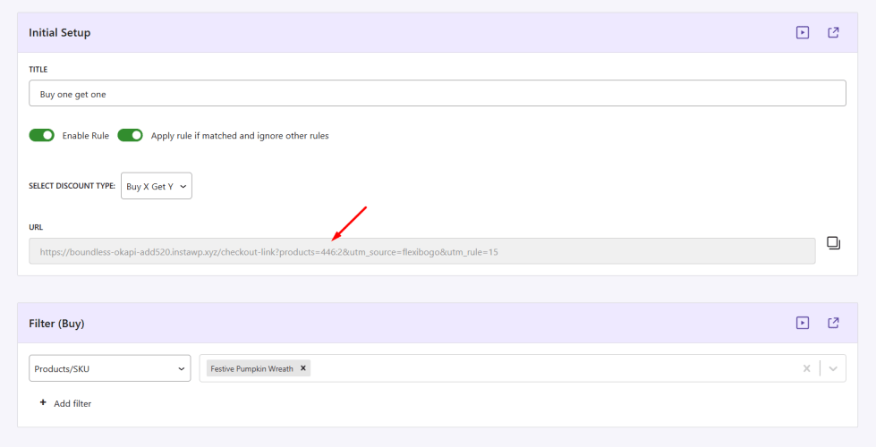 After saving, Flexi BOGO shows a URL like: https://yourstore.com/checkout-link?products=657:2,659:1&utm_source=flexibogo&utm_rule=15