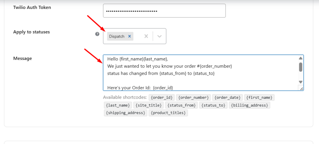 Choose the custom order status. Whenever an order status is changed to this custom status, an SMS will be sent to the customer. For instance, you can go with the custom order status ‘Dispatch’ as shown here: