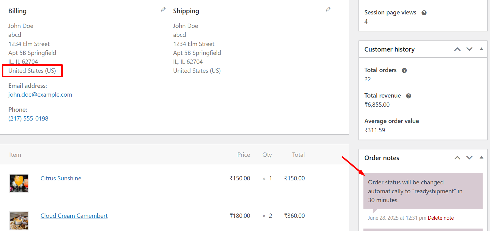 When a customer places an order with the billing country set to India, the order will initially be set to the Packaging status. After the specified time trigger (e.g., 30 minutes), the order status will automatically change to Ready for Shipment.