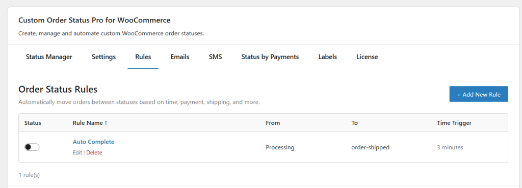 ↑ Back to topLastly, after you have configured all the settings for your custom order status rule, click the “Save” button. Your new rule will now be listed in the Order Status Rules section. In the Order Status Rules list, you’ll see a toggle switch next to each rule. You can enable or disable the rule at any time by clicking this toggle switch.