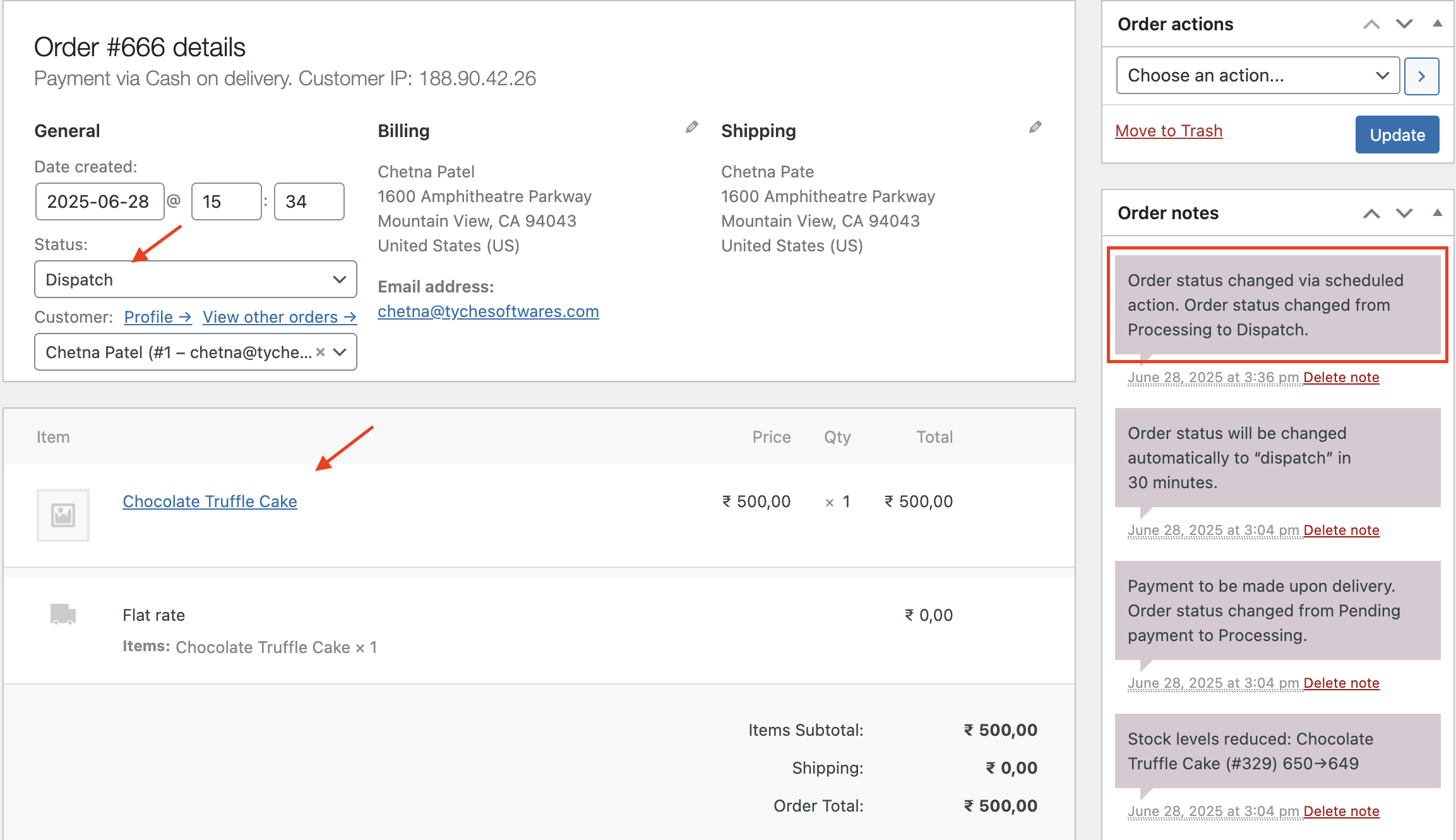 If an order includes the product Chocolate Truffle Cake and its status is set to Processing, the order status will automatically change to Dispatch after the defined time trigger (e.g., 30 minutes).