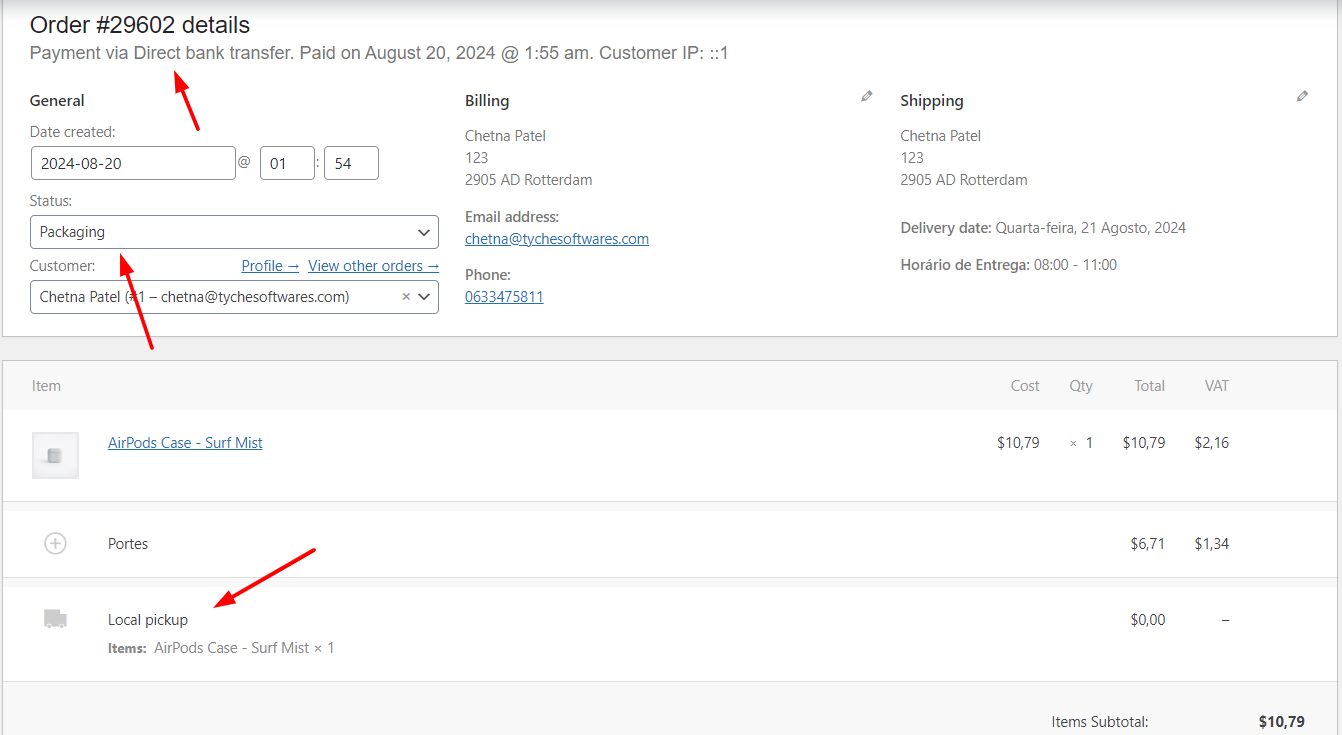 Now, the order was received using the Cash on Delivery payment gateway and the “Zone 1 – Local Pickup” shipping method selected. The order is currently in the “Packaging” status.