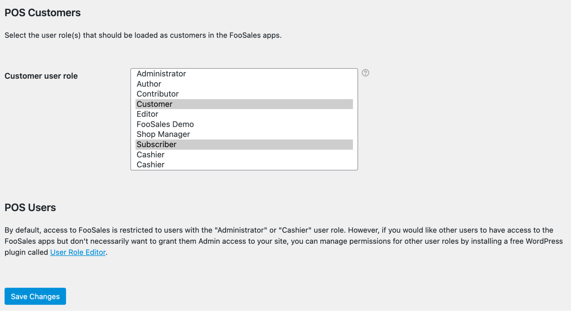 By default, access to FooSales for WooCommerce is restricted to users with the “Administrator” or “Cashier” user role. However, if you would like other users to have access to the FooSales for WooCommerce app but don’t necessarily want to grant them Admin access to your site, you can manage permissions for other user roles by installing a free WordPress plugin called User Role Editor.