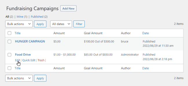 - The Fundraiser can also apply the Search filter to view any specific campaigns.