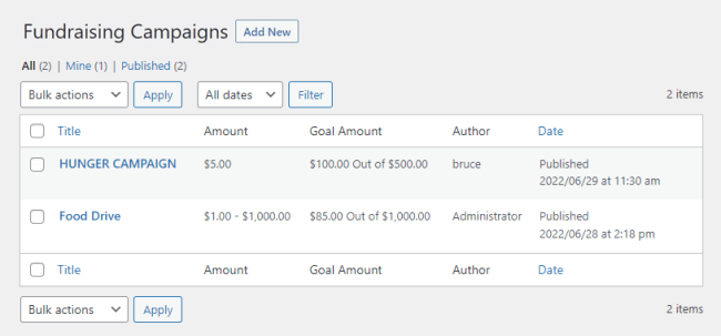 - When the Administrator selects the Published option from the drop-down menu, the status will appear as Published upon creating a new campaign by the Fundraiser on the Front-End. Additionally, the campaign will be visible on the campaign listing page, meaning customers can donate to those specific campaigns.