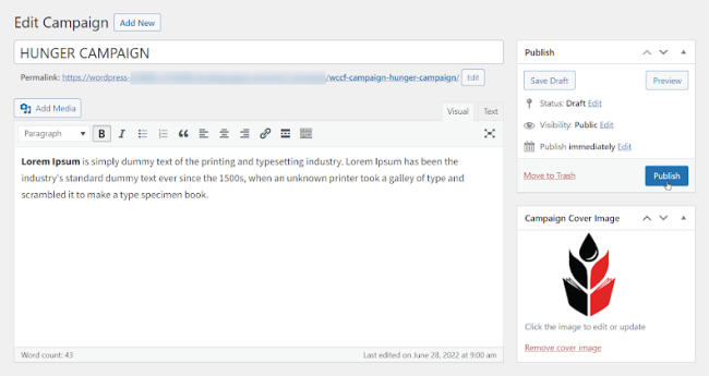 - When the Administrator selects the Published option from the drop-down menu, the status will appear as Published upon updating an existing campaign by the Fundraiser on the Front-End. Additionally, the campaign will be visible on the campaign listing page, meaning customers can donate to those specific campaigns.