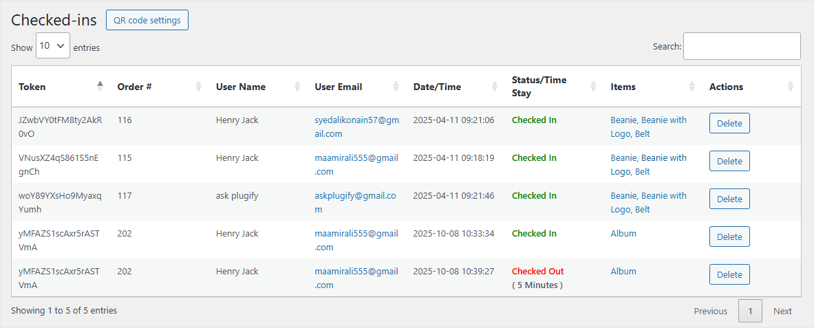 ↑ Back to topNavigate to WooCommerce > Checked-ins to view all records of users who have successfully checked-in and checked-out for the event.